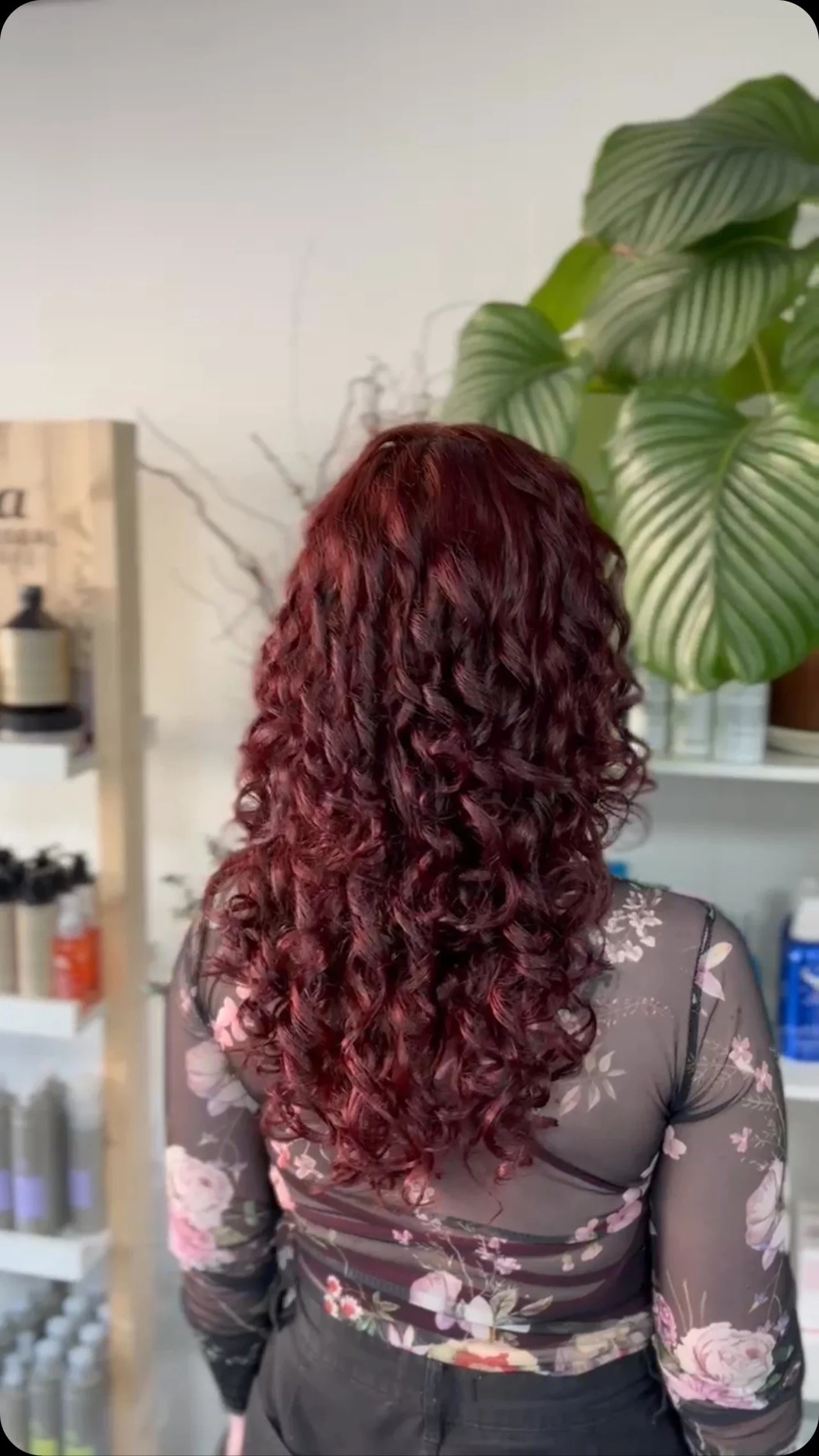 If your appointment consists of CURL mapping, this is where we take the hair and look at the directions in which the curl kinks or waves fall. We will discuss suitable shapes, face, and your curl colour/cutting process begins.